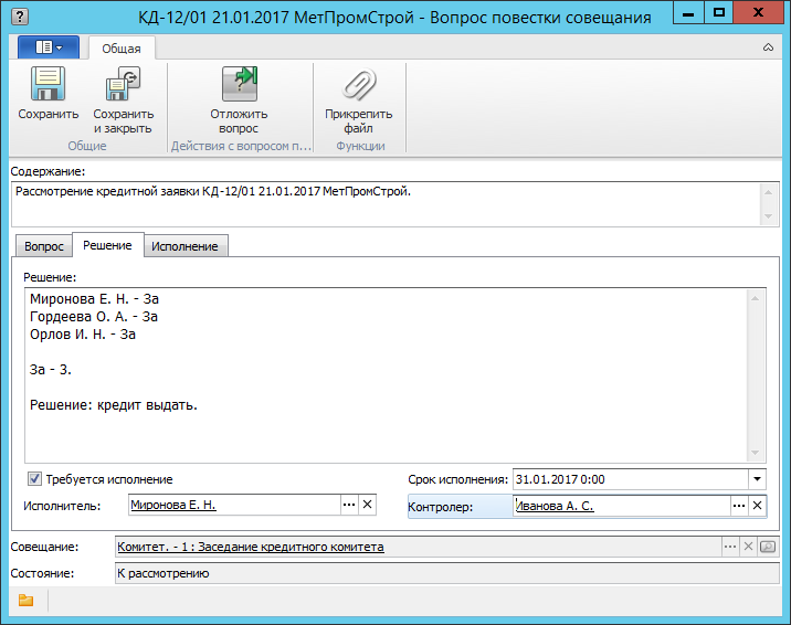 По итогам проведения заседания кредитного комитета в карточке «Заседание кредитного комитета» автоматически производится подсчет голосов по каждой кредитной заявке, а также назначаются исполнители, сроки исполнения и контролеры.